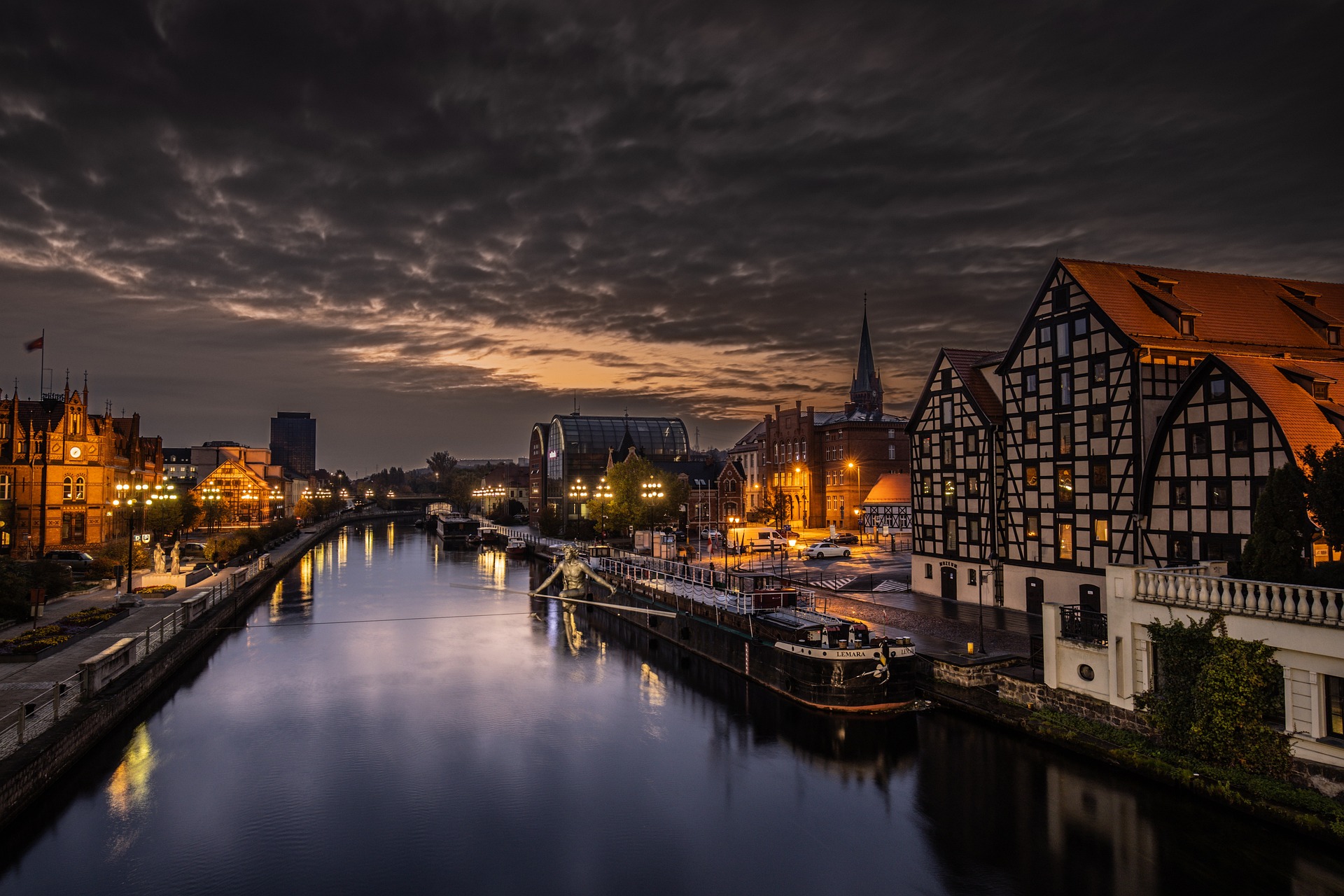 Przejazd do centrum miasta: Opera Bydgoska w formie czterolistnej koniczynki, śluza Kanału Bydgoskiego, Wyspa Młyńska z obiektami należącymi do Muzeum Okręgowego (m.in. spichrze, Muzeum Wyczółkowskiego), Bydgoska Wenecja.